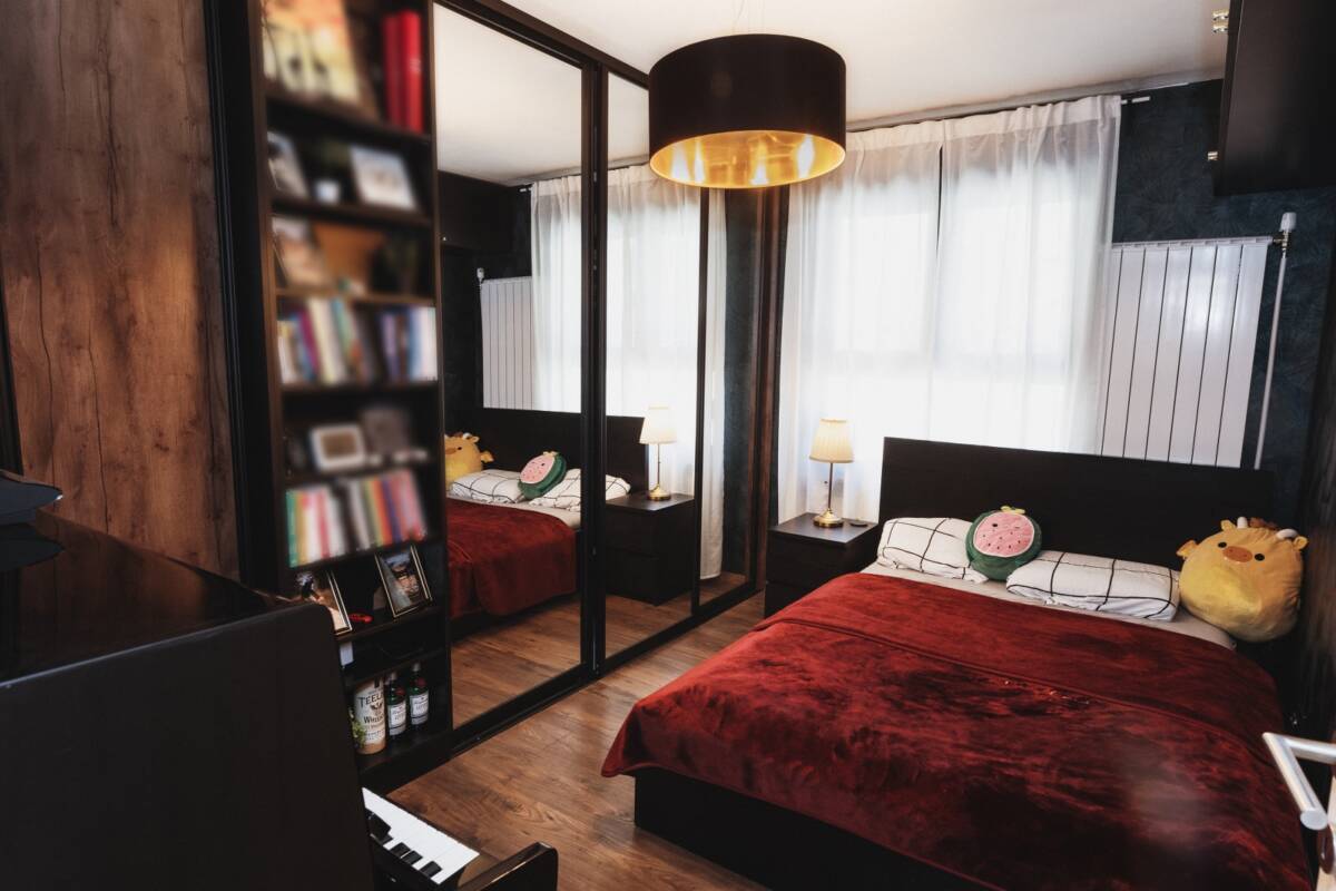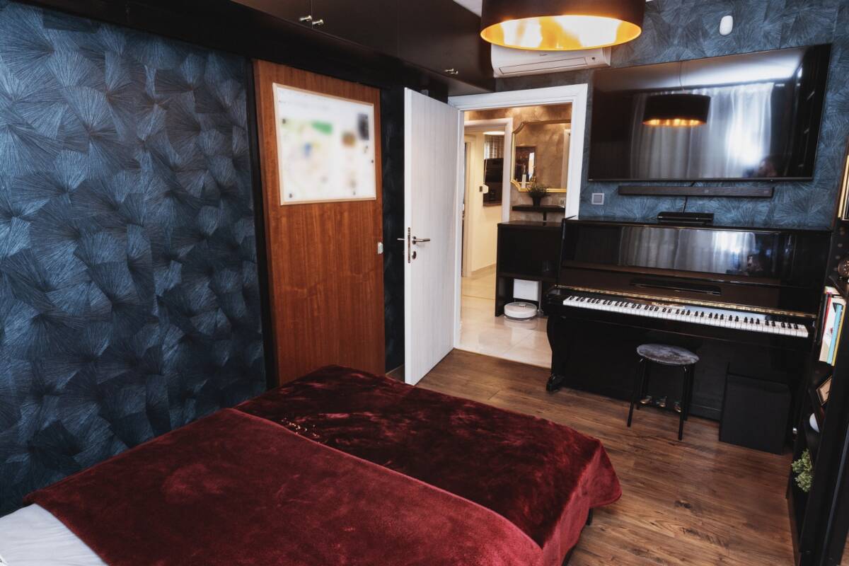 Soba 1 je obučena u plave Njemačke premium tapete iz Tepihlanda, te ima veliki klizni ormar preko cijele strane zida izrađen po mjeri plus policu za knjige i sitne stvari. Na drugoj strani uz strop su ugrađeni ormarići po mjeri u koje se mogu skladištiti dodatne stvari koje se ne koriste svaki dan. Pod je smeđi laminat. Soba 1 je povezana kliznim vratima sa dnevnim boravkom. Na zidu je priprema za televizor. Prozor gleda prema unutrašnjosti dvorišta od zgrade tako da nema buke od prometa.