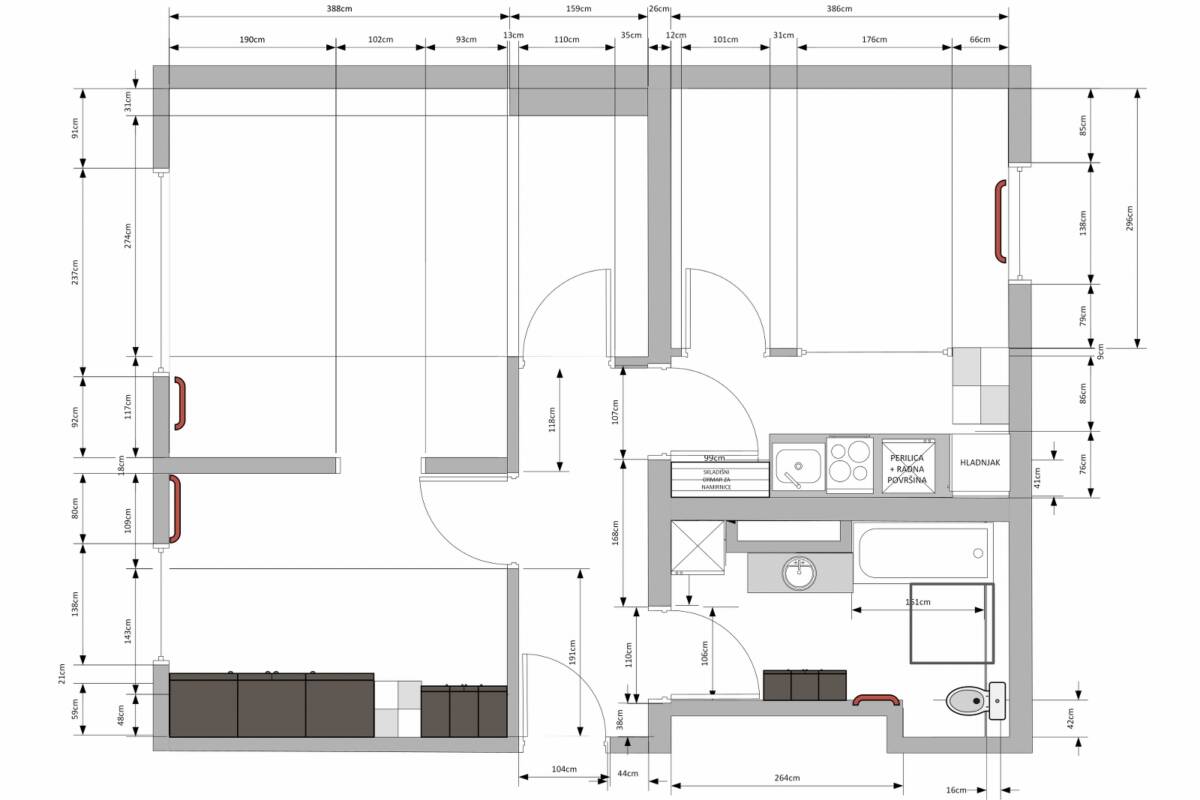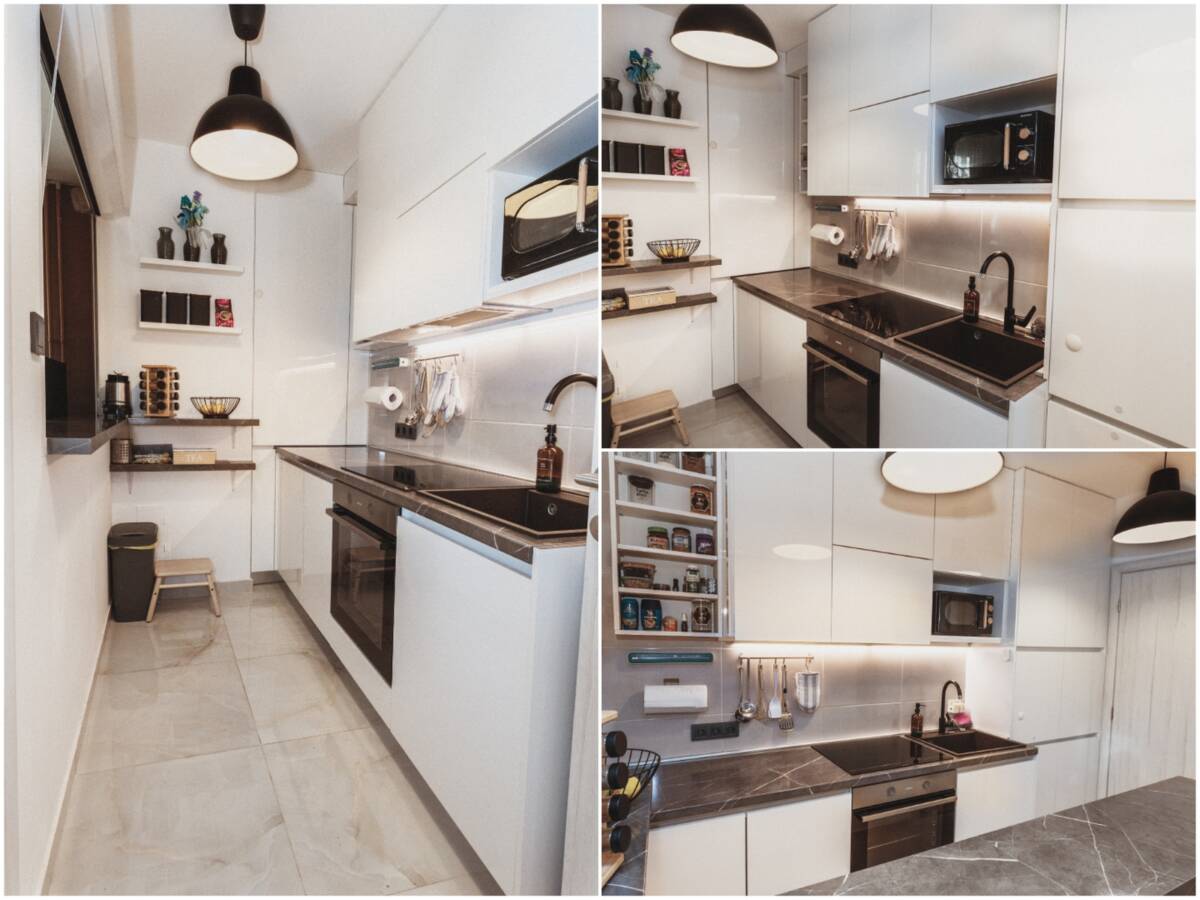 Kuhinja izrađena po mjeri kako bi se maksimalno iskoristio prostor. Hladnjak ugađen u ormar. Pećnica, perilica suđa, indukcijska ploča, ventilacija. Izrađen je šank u sklopu zida koji se može koristiti spojeno sa sobom 2 ili odvojiti na način da se spuste rolete i zatvore vrata.
