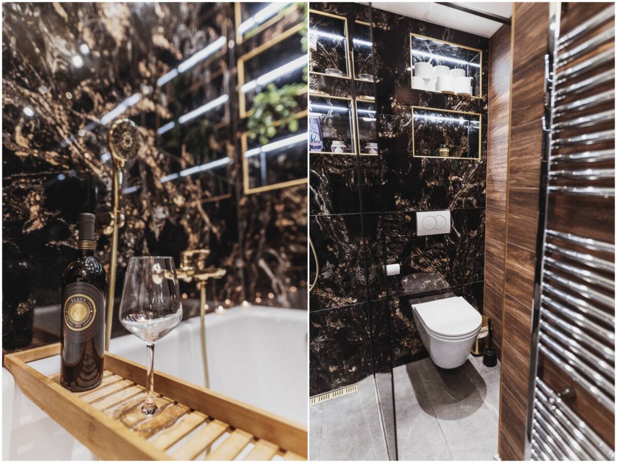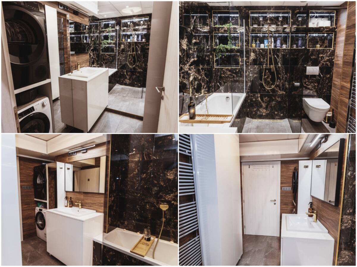 Kupaona je kompletno nova sa kvalitetnom brend opremom iz Feroterma. Velike crno zlatne pločice u imitaciji maramora, zlatne pipe, posebno kada i walk in tuš. Led rasvjeta ugrađena u police u zidu. Spot svjetla + glavno svjetlo. Perilica rublja i sušilica ugrađeni na policu po mjeri. Ormarići po mjeri kako bi se maksimalno iskoristio prostor. Topla voda ide preko toplane. Kromirani okomiti radijator.