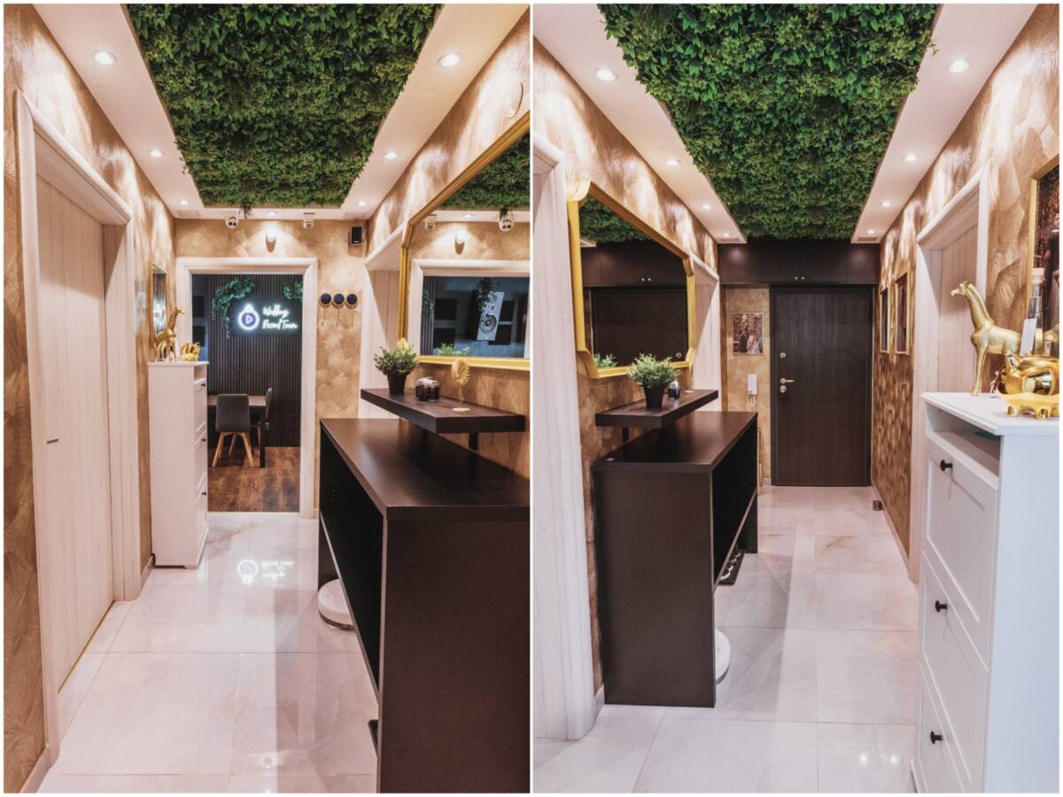 U hodniku premium zlatne tapete uz sjajne bijele pločice i veliko zlatno ogledalo. Strop je obučen u umjetno zelenilo. Spot svjetla koja se uključuju jedno po jedno na senzor. Mali zvučnik koji je također i u svakoj drugoj prostoriji kako bi mogli slušati glazbu u cijelom stanu bez da bude glasna.