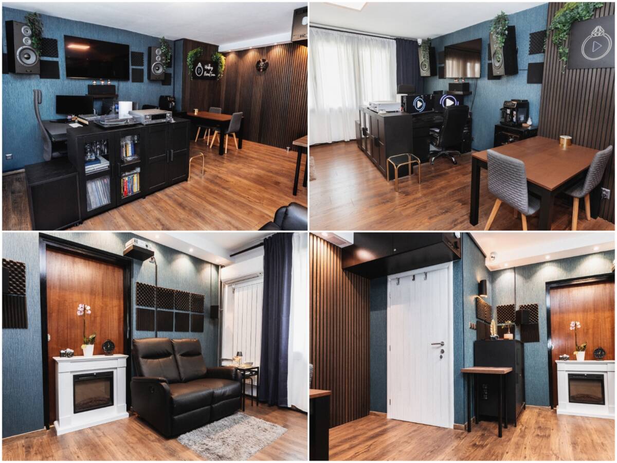 U dnevnom boravku su zidovi obučeni u kombinaciji plavih tapeta i drvenih akustičnih letvica koje vizualno oblikuju prostor i stvaraju ugodan zvuk. Pod je smeđi laminat. Svjetlo ima glavno led te uz zid spot svjetla za moody ambijent. Na zidu je priprema za televizor. Iznad vrata je ugradbeni ormar po mjeri u kojem se nalazi internet, ostala tehnologija i prostor za alat. Prozor također gleda prema unutarnjem dvorištu zgrade. Ispod prozora se nalazi mali travnjak uz koji se može sjesti na mali stolić za jutarnju kavu ili popodnevni boravak na zraku.